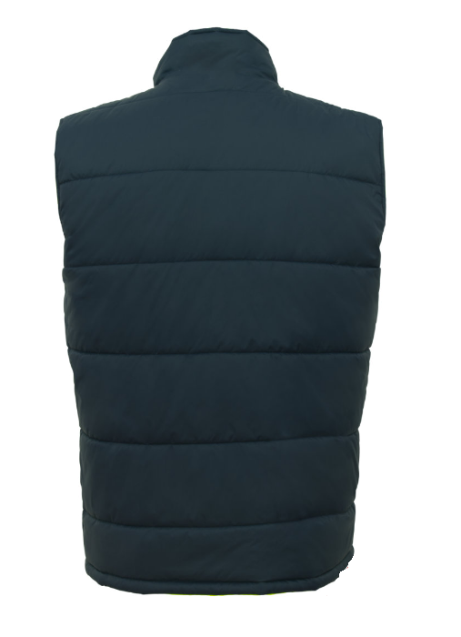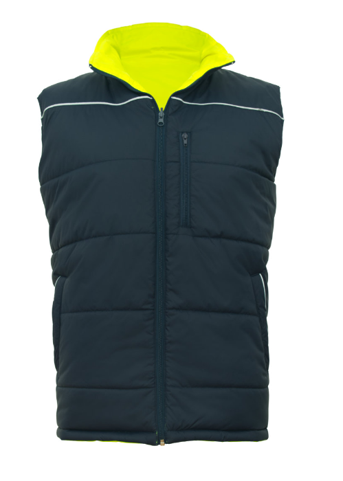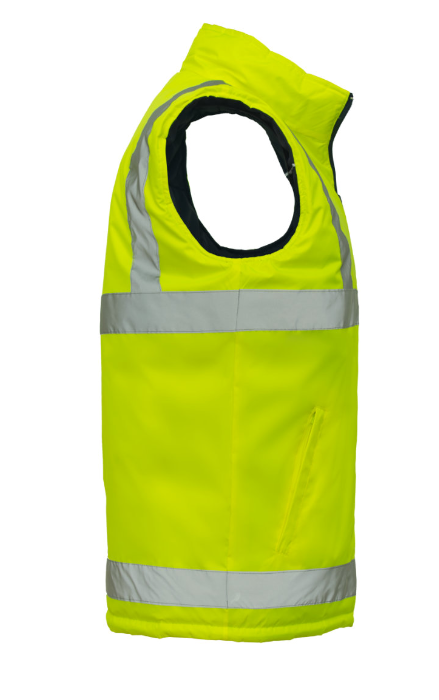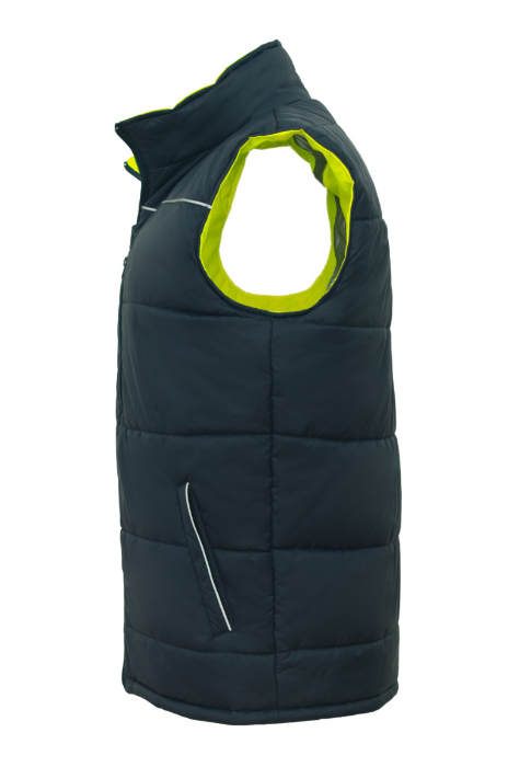 Dwustronny bezrękawnik ocieplany BZR 2SIDE, wykonany ze specjalistycznych materiałów o składzie: materiał żółty Oxford - 100% poliester z powłoką TPU, dzięki czemu zachowuje wysoką wodoodporność, granatowy materiał – 100% nylon tafeta. Doskonale chroni przed wiatrem oraz deszczem. Bezrękawnik ma bardzo niską kurczliwość i stabilny kolor nawet po wielokrotnym praniu.