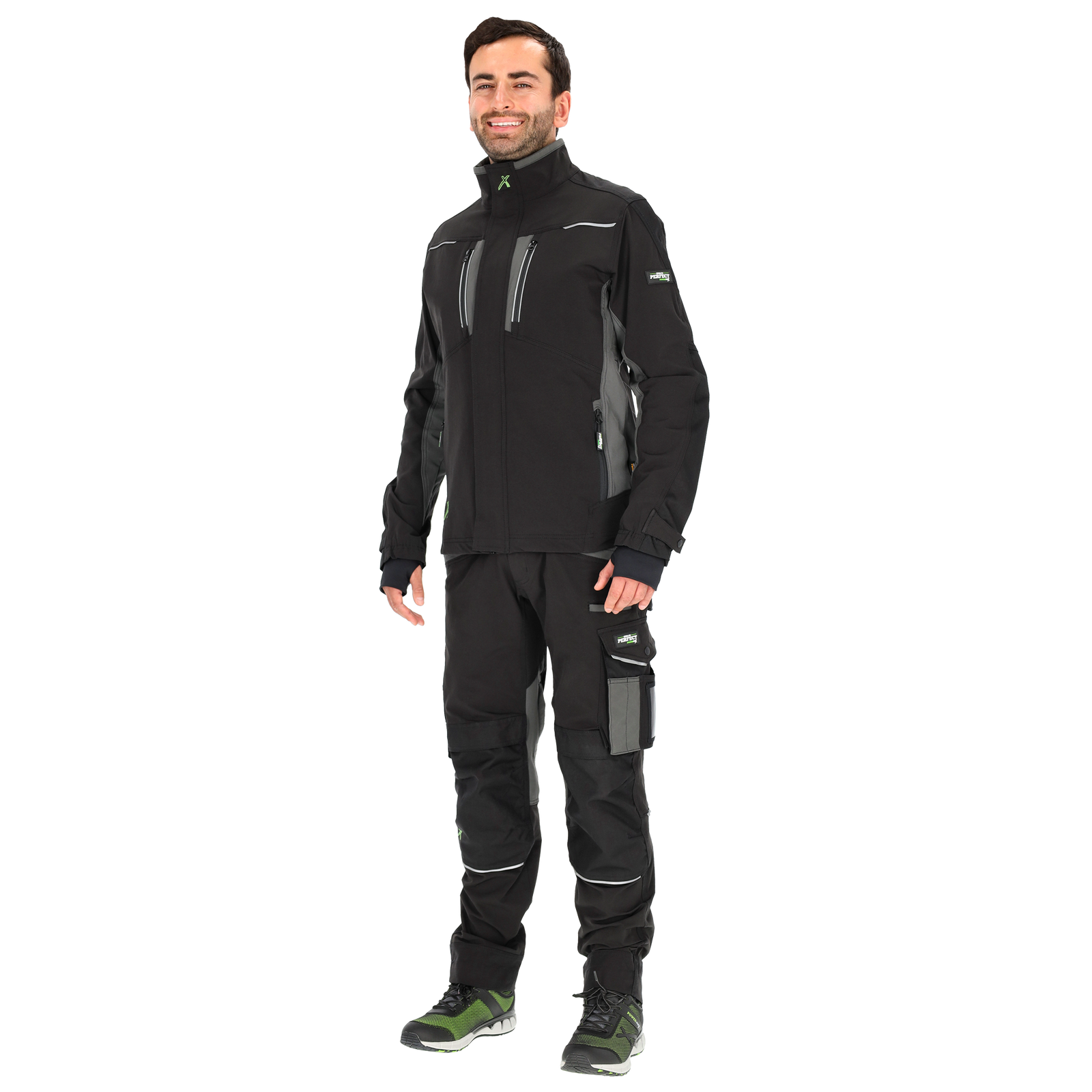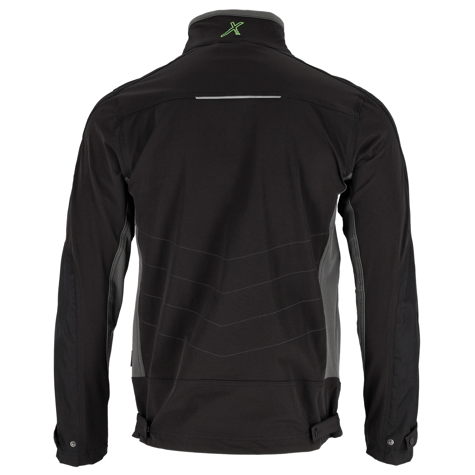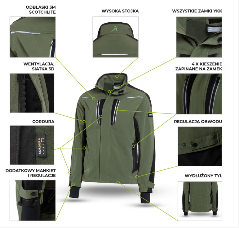 Materiał o właściwościach softshellu zapewnia elastyczność i szybkie schnięcie, chroni przed wiatrem i dopasowuje się do sylwetki, nie ograniczając ruchów. Dzięki dodatkowej regulacji w pasie oraz rękawom z wewnętrznym mankietem i otworem na kciuk, bluza gwarantuje komfort użytkowania podczas wielogodzinnej pracy.