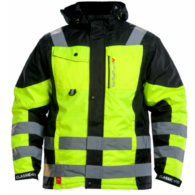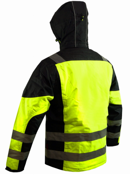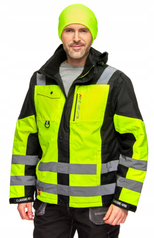 Kurtka w kolorze żółtym fluo z odblaskowymi pasami zapewnia wysoką widoczność użytkowanika.